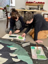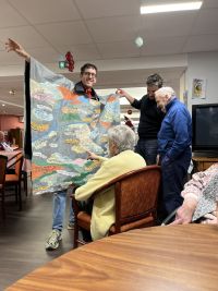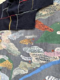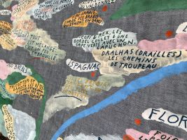 → une grande toile peinte, cousue et rapiécée, qui raconte les arts du petaçatge des personnes habitants des EHPAD