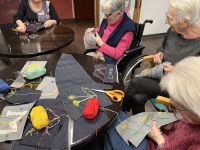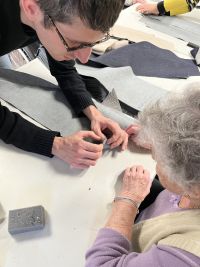 Durant une première semaine (décembre 2023), il s’est s’agi de multiplier les temps d’échange et de collecte avec les personnes résidant et travaillant en EHPAD à propos de leurs rapports aux actes de raccommodage et de leurs rapports à la laine, matière première produite sur le territoire de vie et élément central dans le rapiécement du linge.